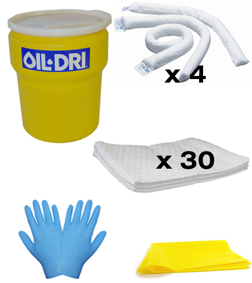This oil only spill kit has all the tools needed for emergency cleanup of up to 10 gallons of petrolem based fluid. All items come in a convenient 10-gallon lab pack. Ideal for small spill applications, keep on hand where quick response is a must.